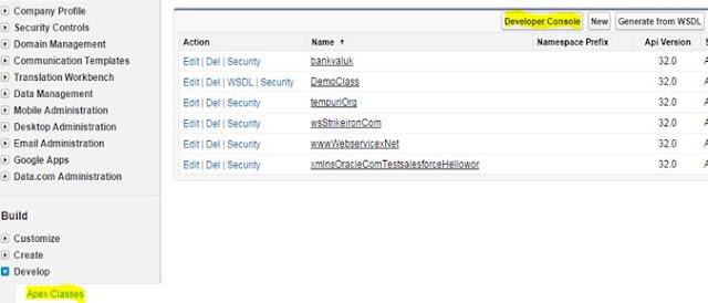 Now once you have the apex class generated for the WSDL , you can test this from Developer Console. Developer console is an inbuilt tool in Salesforce that allows us to test any apex class.